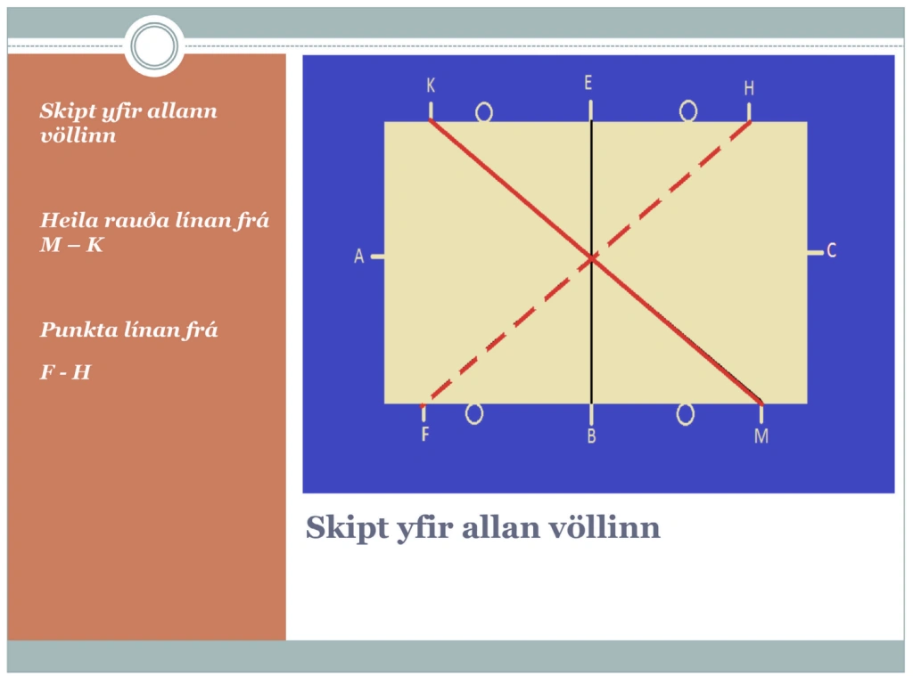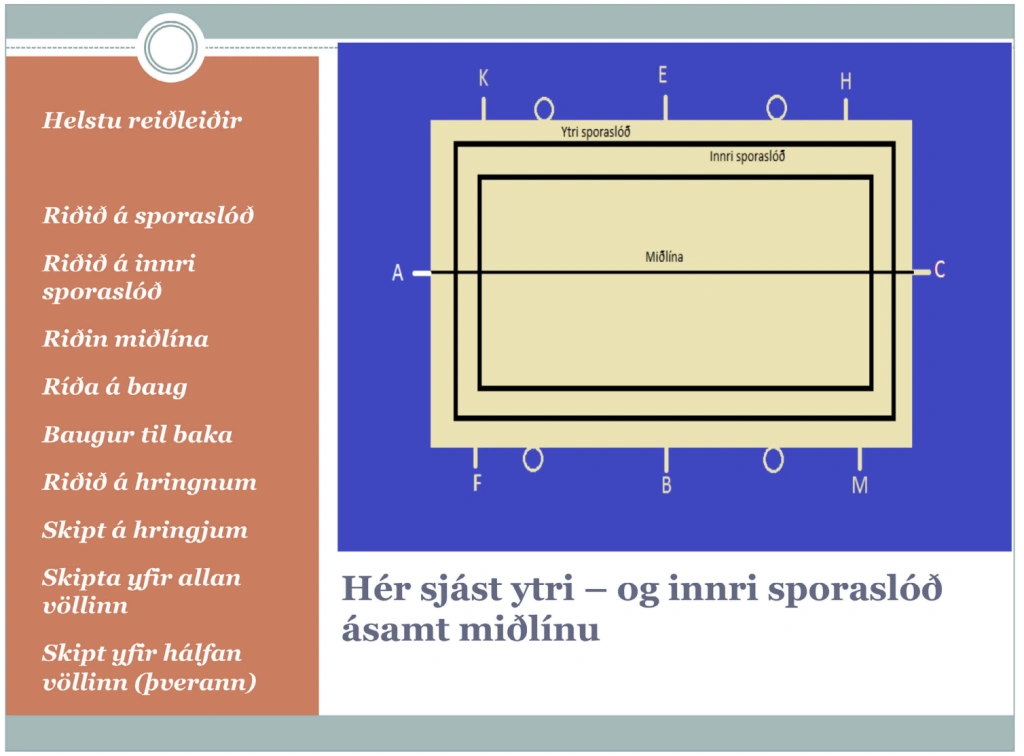 Ekki má stöðva hestinn á ystu sporaslóð. Ef stöðva þarf hest er best að gera slíkt inni á miðjum velli.