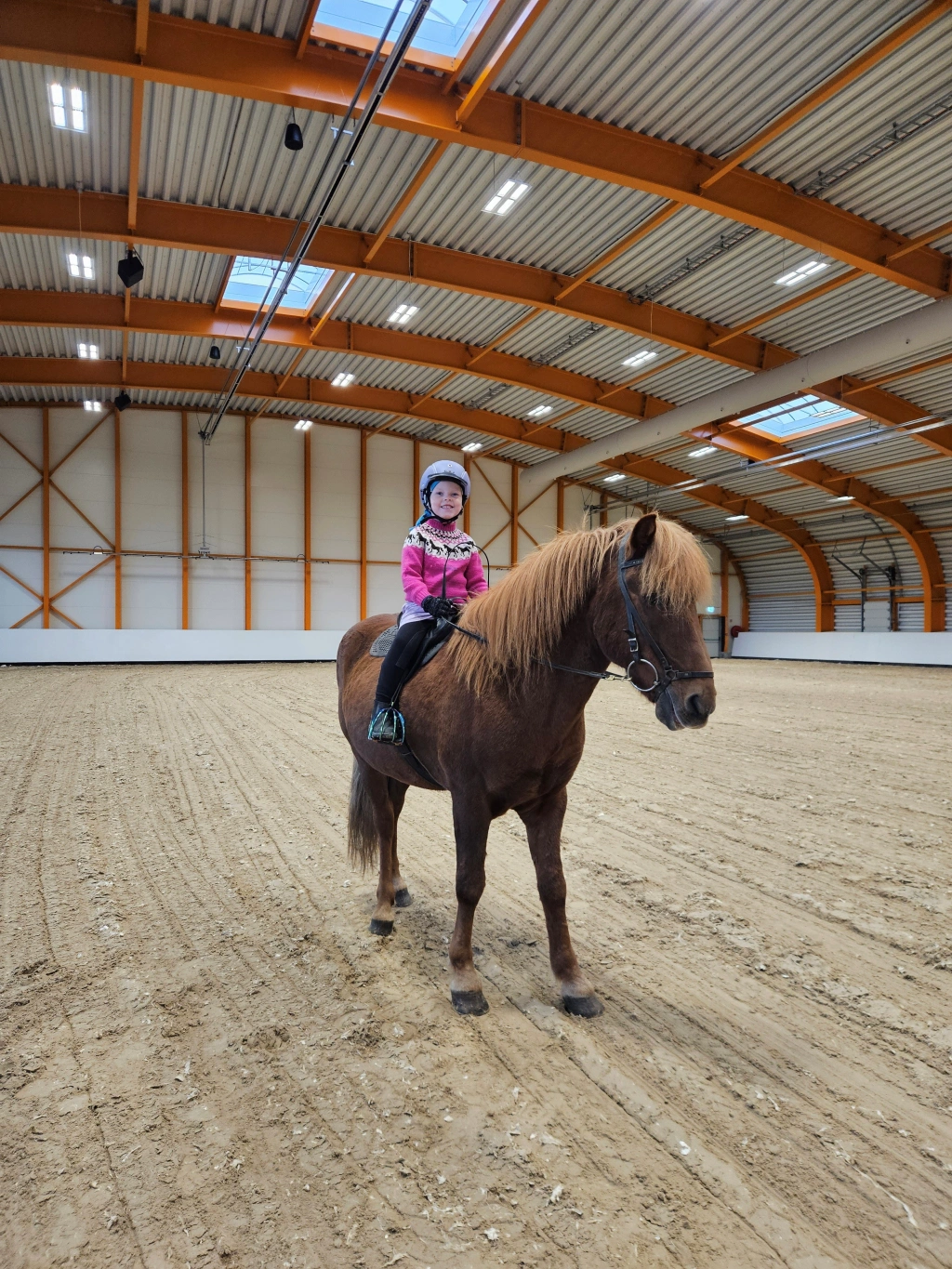 Hin 4 ára Stefanía Birna Ingólfsdóttir á stóðhestinum Eldjárni frá Tjaldhólum reið á vaðið og tók nokkra hringi í höllinni. Vel fór á með knapa og hesti og mikil ánægja með aðstæður.
