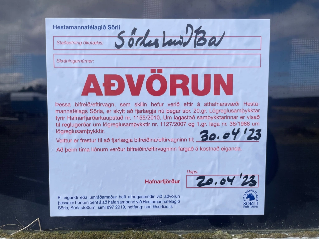 Eigandi þessa hjólhýsi er vinsamlegast beðinn um að fjarlægja það strax, eigi síðar en 30. apríl 2023, annars verður það fjarlægt/fargað á kostnað eiganda.