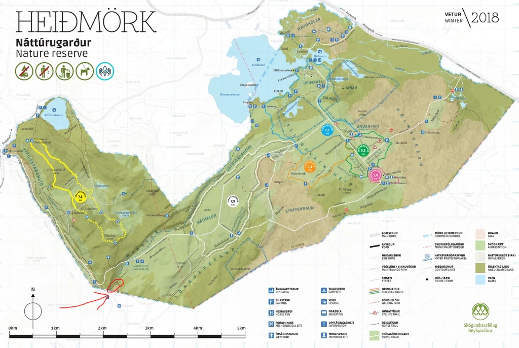 Leiðin sem verður farin liggur frá Þjóðhátíðarlund og yfir í Vífilstaðahlíðina og þarf að þvera reiðstíg.