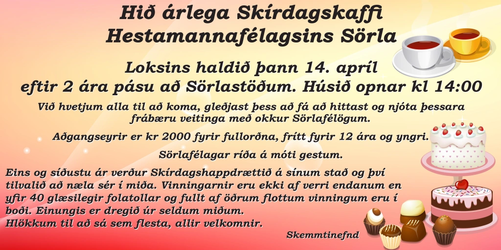 Loksins getum við haldið okkar árlega skírdagskaffi Hestamannafélagsins Sörla á fimmtudaginn 14. apríl 2022 að Sörlastöðum.
