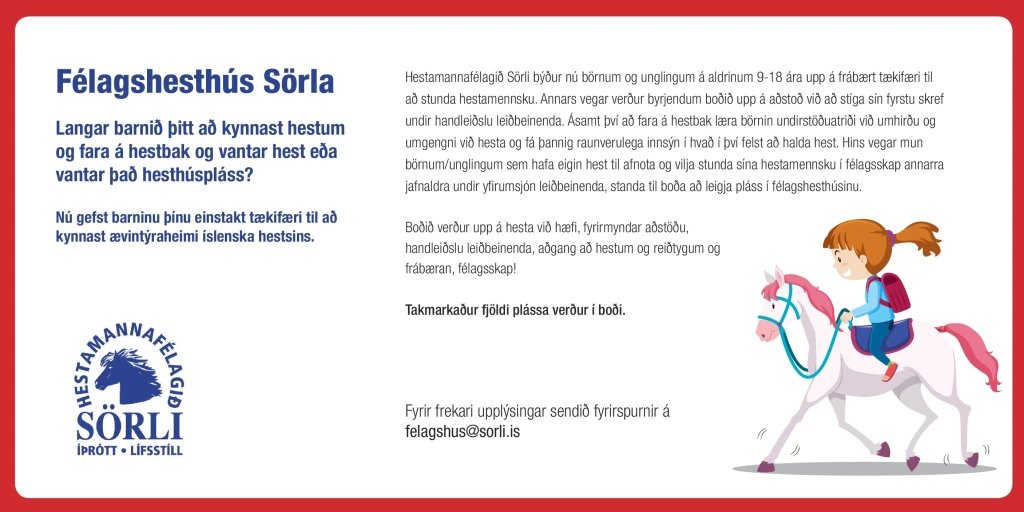 Starf Félagshesthúss Sörla hefst á ný í byrjun janúar, foreldrar þeirra barna sem eru í starfinu og ætla halda áfram eru vinsamlegast beðnir um að skrá börnin sín aftur í gegnum Sportabler sem fyrst.