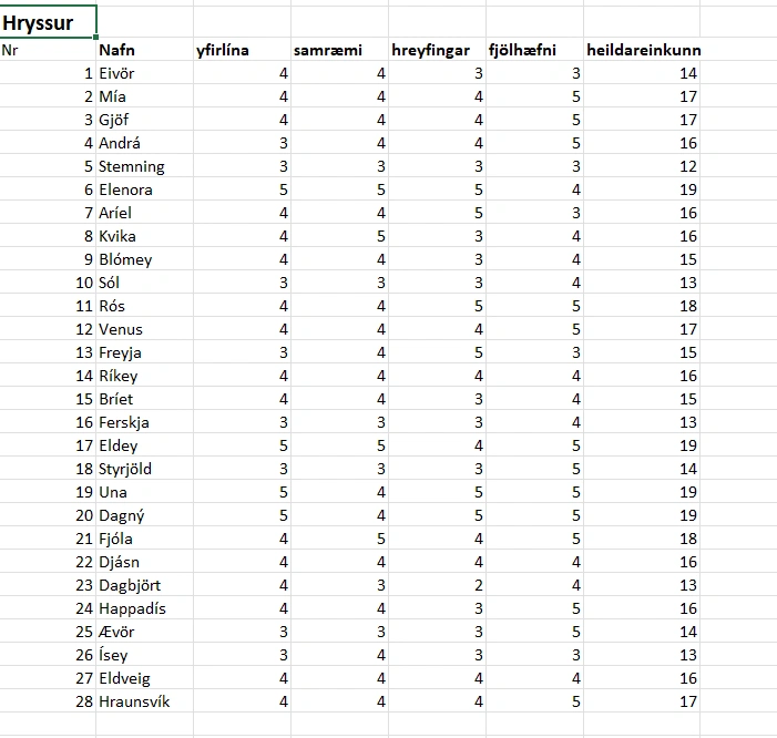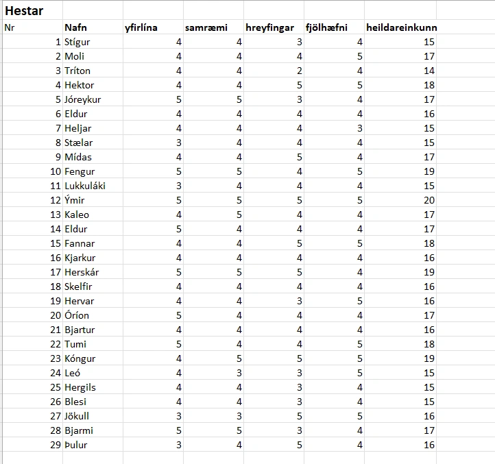 Hér koma folöldin sem kepptu til úrslita og meðfylgjandi er skjal með tölum um öll folöldin, en dómarar dæmdu yfirlínu, samræmi, hreyfingar og fjölhæfni á skalanum 1-5.