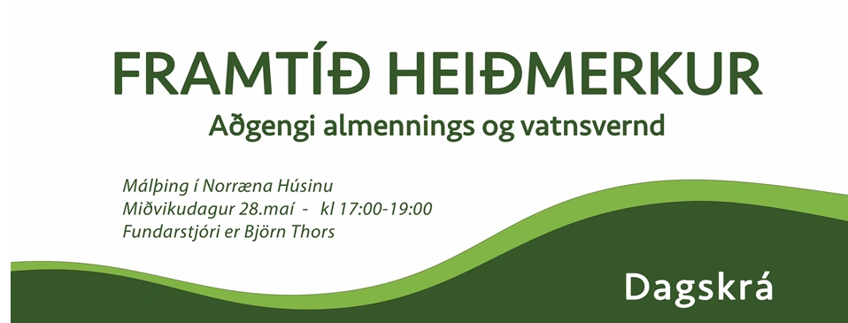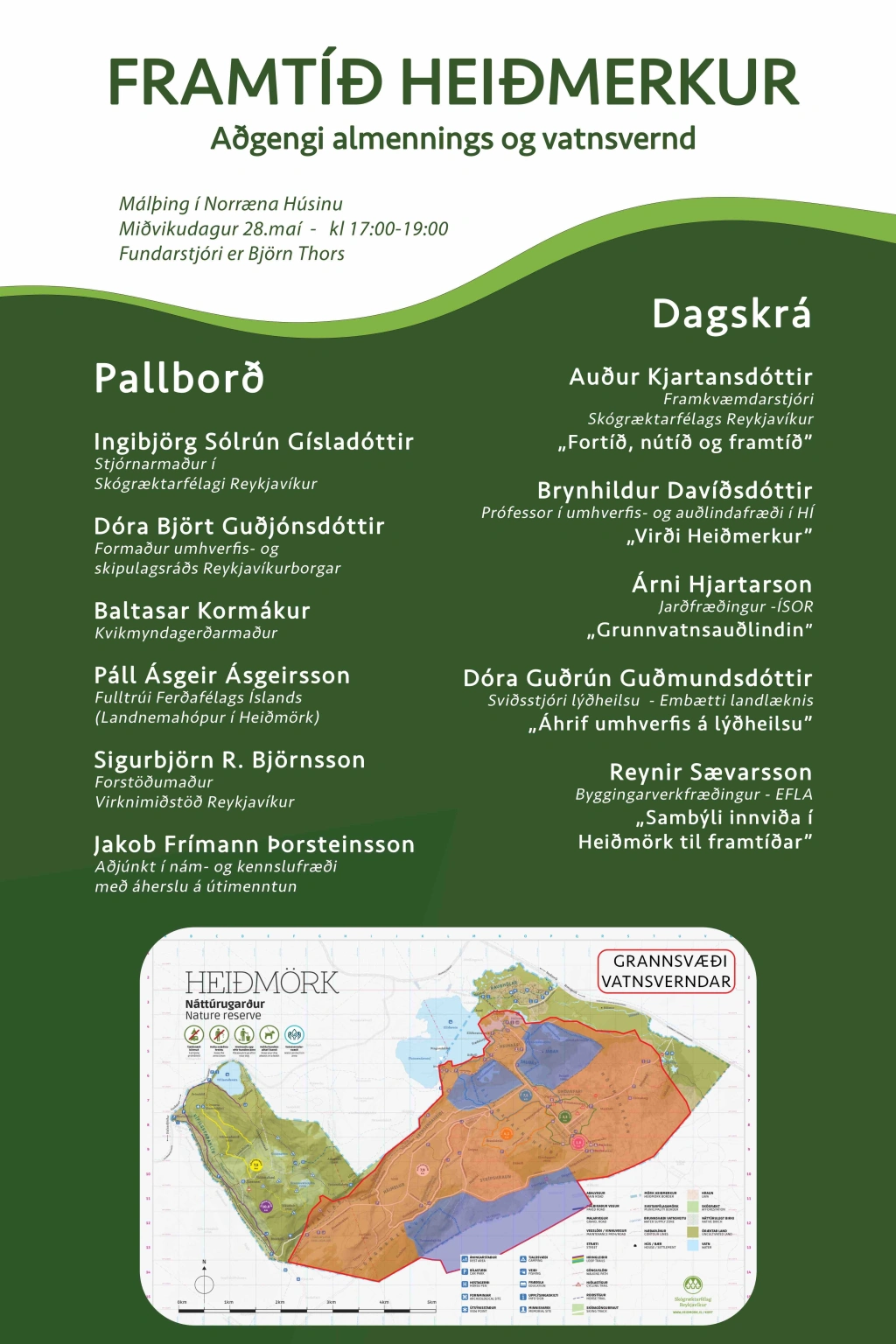 Miðvikudaginn 28. maí - kl 17:00-19:00 fer fram málþing um framtíð Heiðmerkur - aðgengi almennings og vatnsvernd, í Norræna húsinu á vegum Skógræktarfélagi Reykjavíkur.