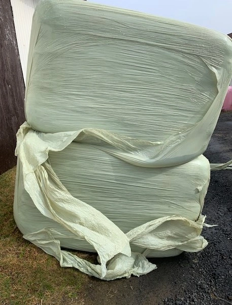 Eingöngu má setja rúlluplast í gáminn ekki böndin eða netin af rúllunum og ekkert annað plast.