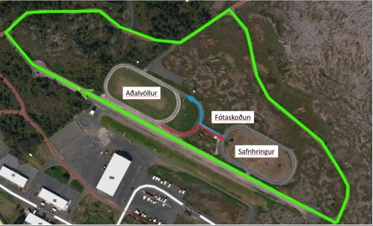 Í gæðingaskeiði og 100 m skeiði er ferjuleið sýnd með grænu á kortinu. Að loknum fyrri spretti skulu knapar fara eftir ferjuleið til þess að vera tilbúnir í seinni sprett.