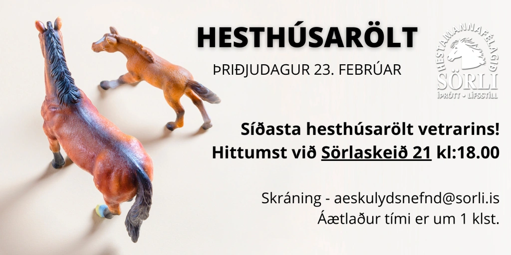 Hesthúsarölt verður þriðjudaginn 23. febrúar. Síðasta hesthúsarölt vetrarins! Hittumst við Sörlaskeið 21 kl. 18:00.
