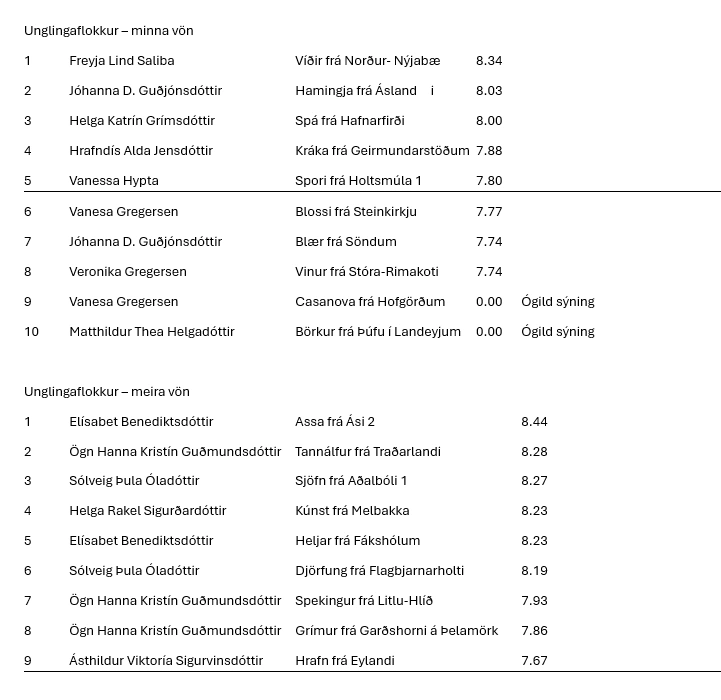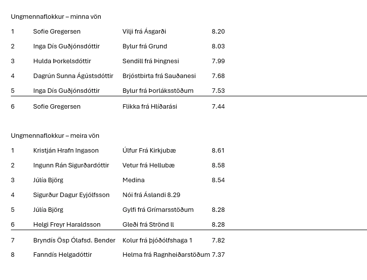 Fimm eru í úrslitum. Ef knapar hafa komið tveimur hestum eða fleirum í úrslit velja þeir einn hest til að mæta í úrslit og senda val sitt á motanefnd@sorli.is. Einnig er mikilvægt ef knapar skrá sig úr úrslitum að þeir geri það eins fljótt og auðið er. Þetta er mikilvægt því aðrir keppendur sem eru fyrir utan úrslit hafa þá möguleika á að ríða úrslitin.