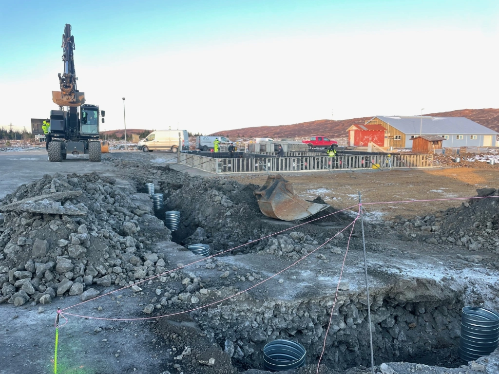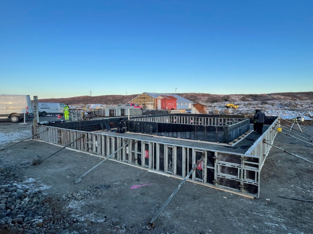 Verið er er að slá upp sökklum fyrir húsinu en þetta verður stálgrindarhús, klætt með yleiningum. Um leið og sökklarnir verða steyptir verða einnig steyptir niður staurar fyrir gerðið.