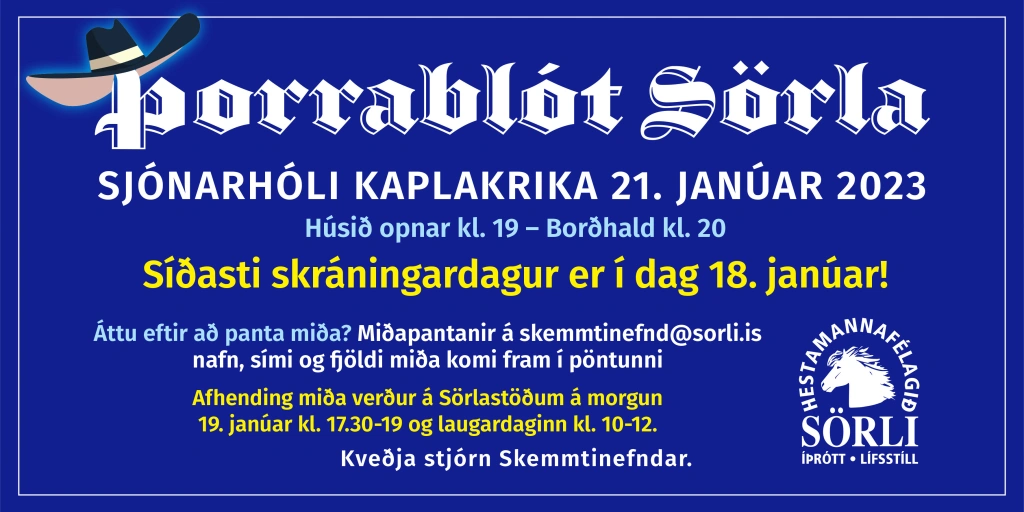 Afhending miða verður á Sörlastöðum fimmtudaginn 19. janúar kl. 17.30-19 og laugardaginn kl. 10-12.