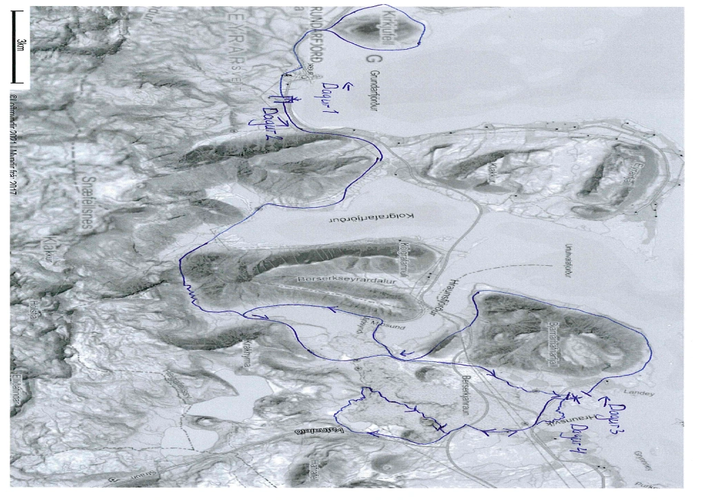 Dagur þrjú – Umhverfis Bjarnarhafnarfjall yfir Mjósundabrú og inn Hraunsfjörð vestanverðan og aftur í Bjarnarhöfn, um 30 km.