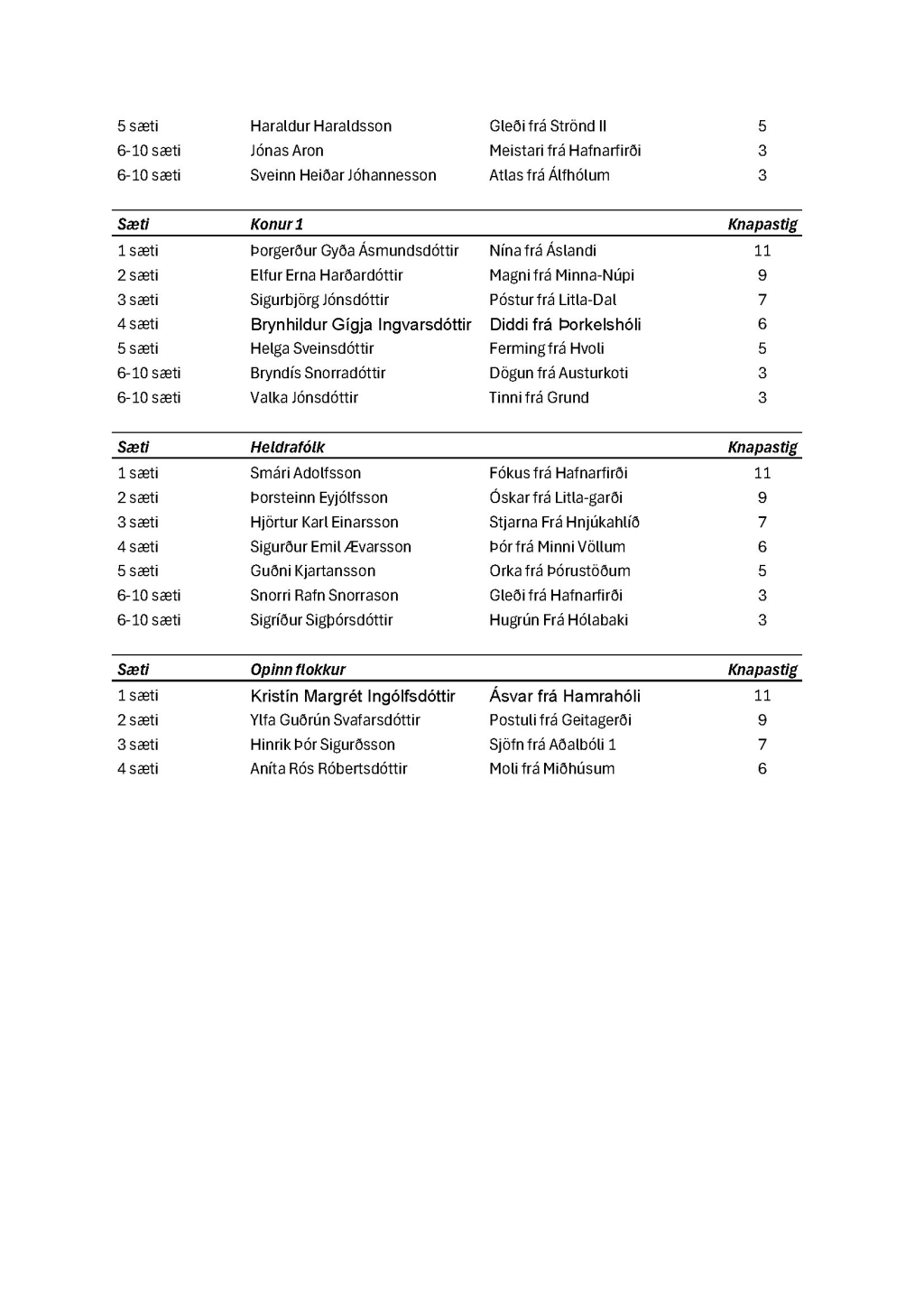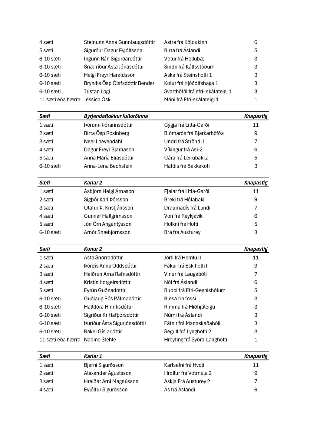 Karlaflokkar og kvennaflokkar voru ekki síður spennandi. Ásbjörn Helgi Árnason og Fjalar frá Litla-Garði sigruðu í Karlaflokki 2, á meðan Ásta Snorradóttir og Jörfi frá Hemlu II unnu Konuflokk 2. Í sterkum kvenna- og karlaflokki 1 tryggðu Þorgerður Gyða Ásmundsdóttir og Nína frá Áslandi sér sigur í kvennaflokki, en Bjarni Sigurðsson og Karlsefni frá Hvoli sigruðu í karlaflokki.