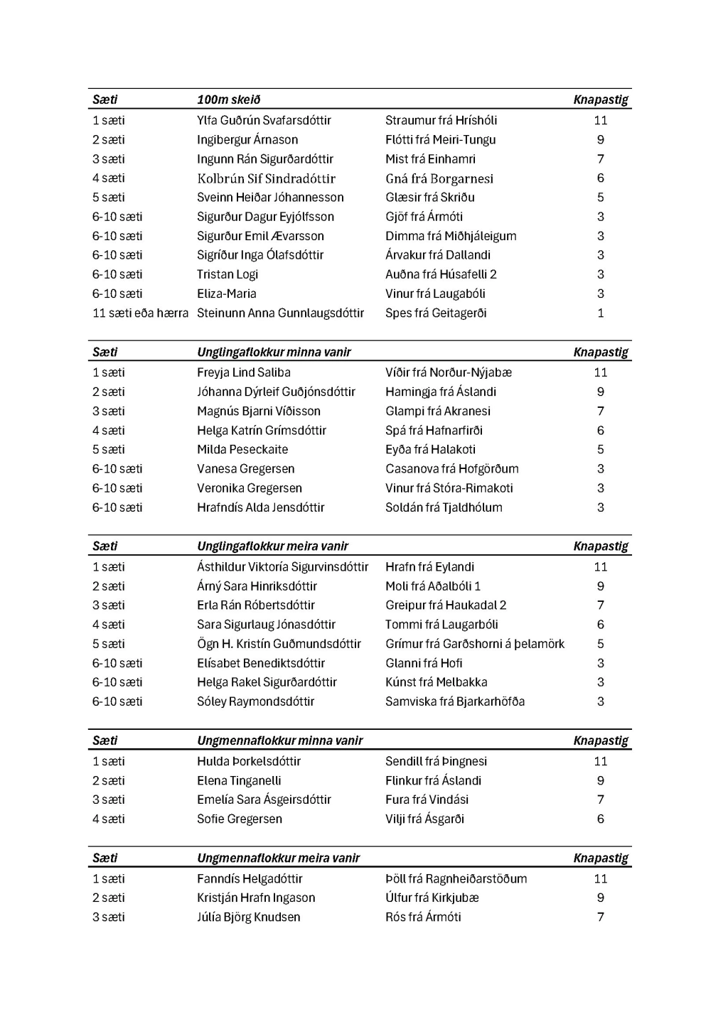 100 metra skeiðið var afar spennandi, þar sem Ylfa Guðrún Svafarsdóttir og Straumur frá Hríshóli voru hraðast með tímann 8,1 sekúndu og bættu sig um hálfa sekúndu frá síðasta vori.